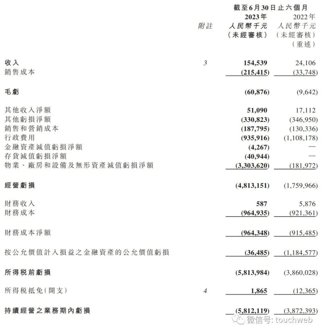 恒大汽车2023年上半年营收为1.55亿元,上年同期的营收为2411万元;毛亏损为6088万元,上年同期毛亏损为964万元。