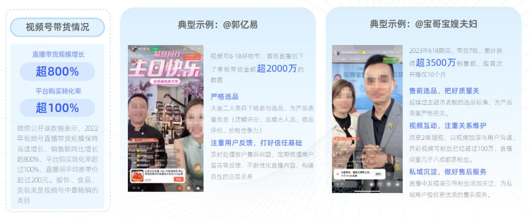 腾讯对外给出的成功案例皆是生活赛道出来的,例如郭亿易、宝哥宝嫂夫妇账号,走的都是夫妻档路线,平时所更新的内容都是生活中与家庭相处的小故事。二者都是在真诚、信任的基础上,加以严格的品控、全套的售后服务,成为视频号带货的头号人物。