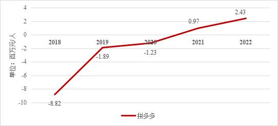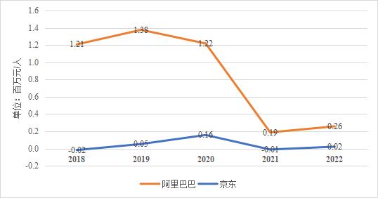 图2:2018-2022年拼多多、阿里巴巴&京东人均净利对比图 资料来源:穆胜咨询整理,拼多多、阿里巴巴&京东财报