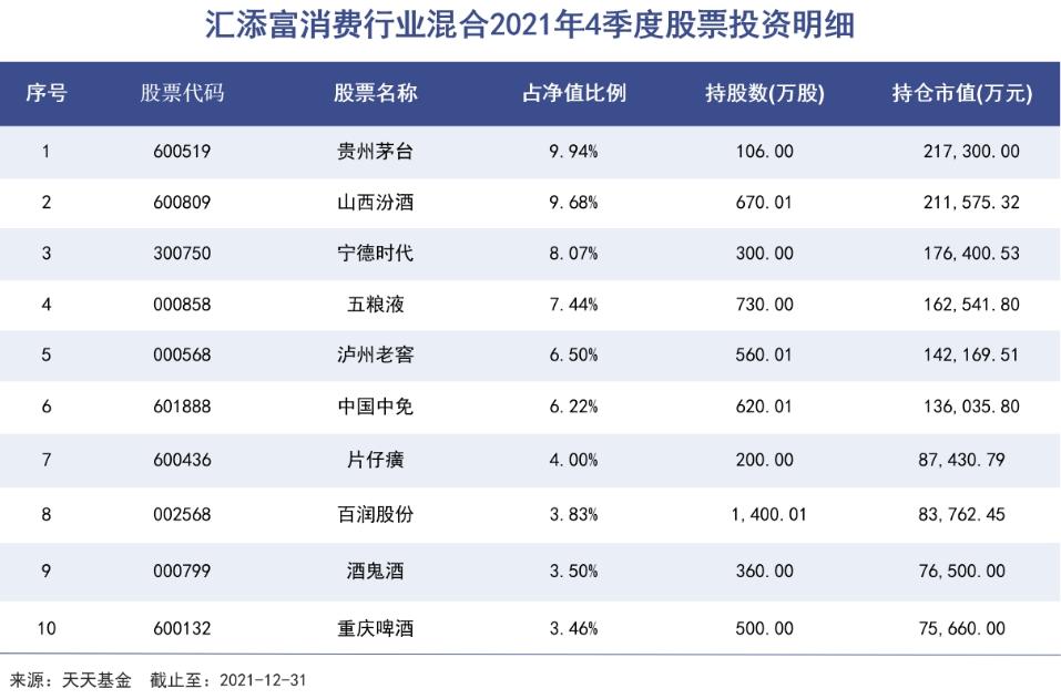 “跨界”赶时髦的,还有管理汇添富消费行业的胡昕炜,在2021年下半年,由于消费股整体估值偏高,胡昕炜开始调仓换股。并于当年二季度开始重仓宁德时代,四季度已经持有其300万股,位居该产品第三大重仓股。