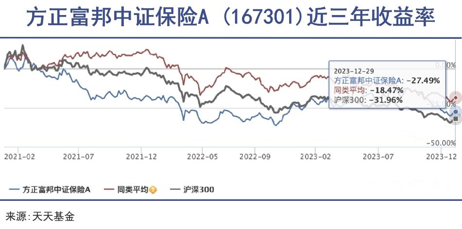 而正是由于重仓宁德时代,原本领先同行的中证方正富邦保险的业绩在2022年开始,就一落千丈,至今都远远跑输同类平均水平。