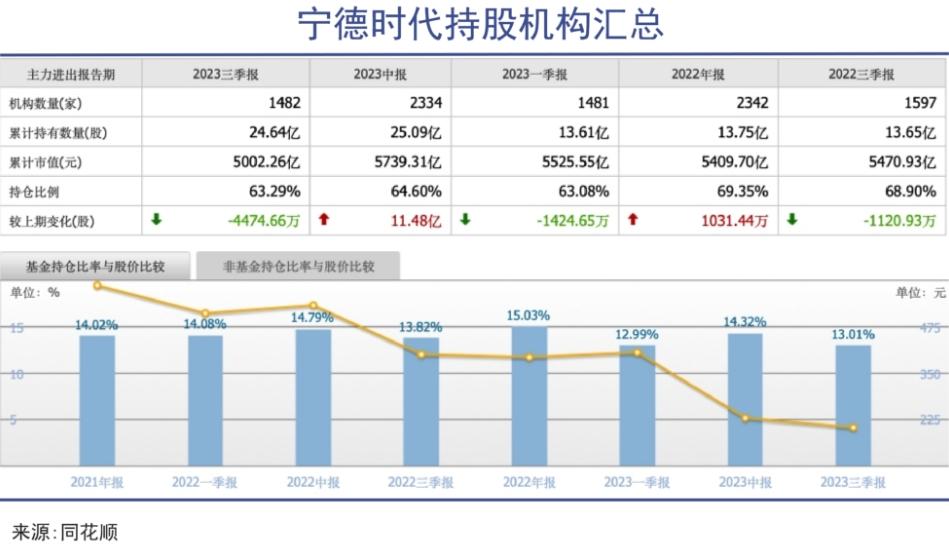 2021年四季度,127家基金公司共1676只产品重仓宁德时代,合计持有市值达1529亿元。到2023年三季度末,持股基金进一步降至1430只,持股机构数量和持仓比例呈现下降趋势。