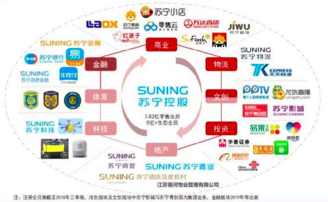 为了给苏宁引流同时也丰富产业模式,张近东剑走偏锋,带领苏宁在各大领域疯狂扩张。