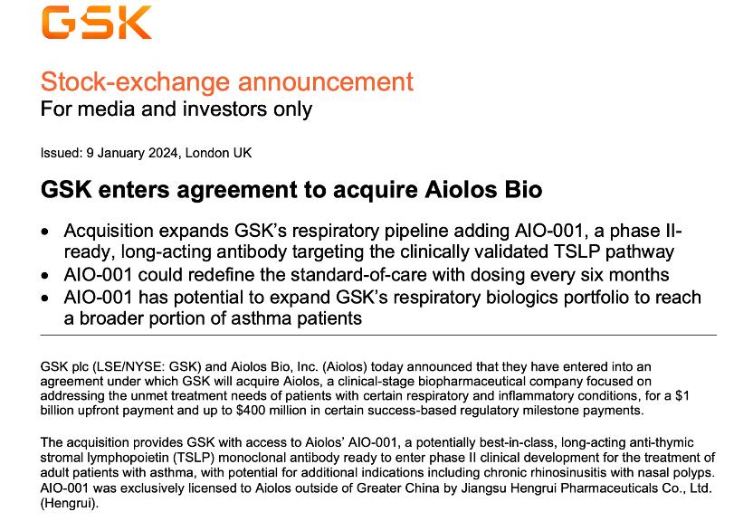 GSK和Aiolos Bio今天宣布,GSK将以10亿美元的预付款和高达4亿美元的某些成功基础的监管里程碑付款,收购致力于解决患者在某些呼吸道和炎症性疾病方面未满足的治疗需求的临床阶段生物制药公司Aiolos。