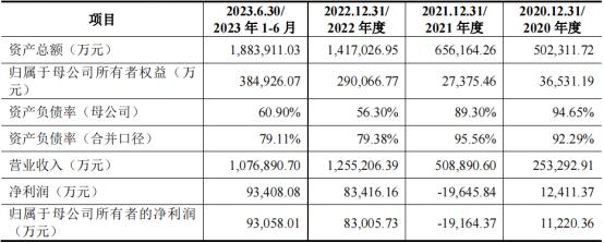 财务方面,根据招股书,2020年到2023年上半年,中润光能营业收入分别为25.33亿元、50.89亿元、125.52亿元、107.69亿元;归母净利润分别为1.12亿元、-1.92亿元、8.30亿元、9.31亿元。