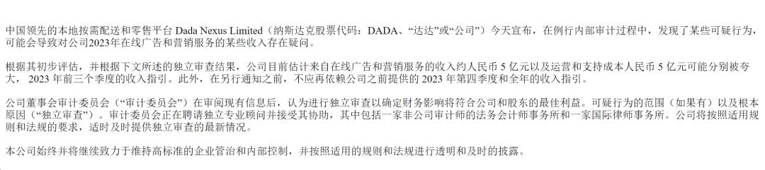 据初步评估和独立审查结果,公司估计有约 5 亿元的广告收入以及对应的运营和支持成本被夸大了。此外,公司之前提供的 2023 年第四季度和全年的收入指引也不再可靠。”( 也就是说,达达三季报中预计 2023 年第四季度总收入在 30 亿元至 33 亿元,这个 30 亿的数字也不可信了 )