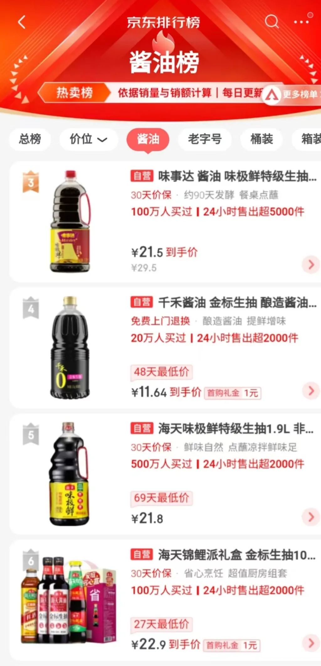 广东位于北回归线,气候温暖,阳光充沛,年均光照时间长达2300小时,在晾晒环节有天然优势,因此翻一翻广东酱油的品牌历史,几乎个个都是几百年的老字号。搜索京东,销量名列前茅的酱油品牌,大多数是广式酱油。