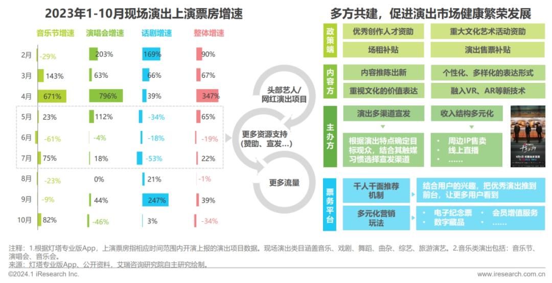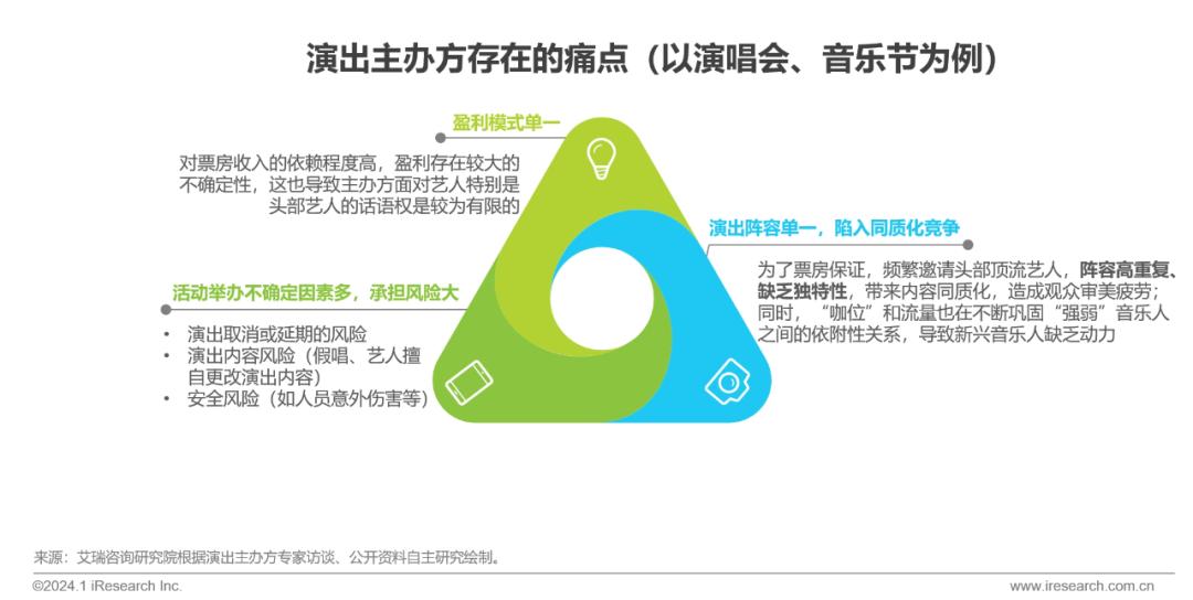 2022年底以来,我国经济社会全面恢复常态化运行,剧院、音乐厅等线下娱乐场所有序恢复,线下文娱消费需求得到集中释放,2023年前三季度全国营业性演出场次、票房收入及观众人数较2019年同期均实现显著增长。但不同演出门类之间及演出门类内部的分化现象表现明显,大型演唱会/音乐节项目呈现超强吸睛吸金能力,而小型演出或中腰部艺人演出在流量、宣推资源等方面存在劣势,且运营成本升高,生存压力加大。于主办方而言,其承担着高昂的成本与演出活动举办风险,票房收入占比过高导致盈利结构单一,更倾向于与头部艺人合作,导致演出阵容重复率高,面临同质化竞争的挑战。