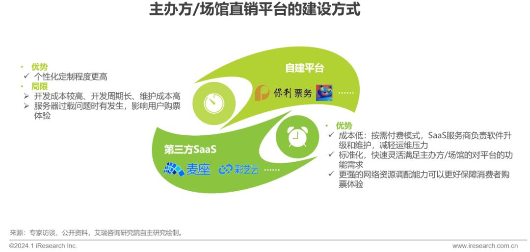 主办方或场馆建设直销平台一般有两种方式,一种是自建平台,如保利票务、纷玩岛等,另一种是采用第三方SaaS平台,如单立人、嵩山龙门俱乐部采用第三方SaaS平台彩艺云。自建直销平台的优势在于个性化定制程度更高,局限在于开发成本较高、开发周期长、维护成本高,加之服务器部署在本地,常常会遇到热门项目开票后访问过载导致服务器瘫痪的问题;第三方SaaS的主要优势在于SaaS服务商可根据需求快速灵活定制保障快速实施,更强的技术服务能力和网络资源调配能力可以更好保障消费者购票体验,成本优势也更加突出。