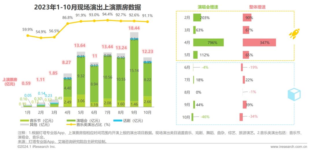 从2023年1-10月份数据来看,上半年高速增长的演唱会进入下半年后,增速回落趋势明显,特别是在10月份出现了负增长,上演票房环比下降46%。从长期来看,短期的井喷式现场演出需求必然会有回归理性的过程。