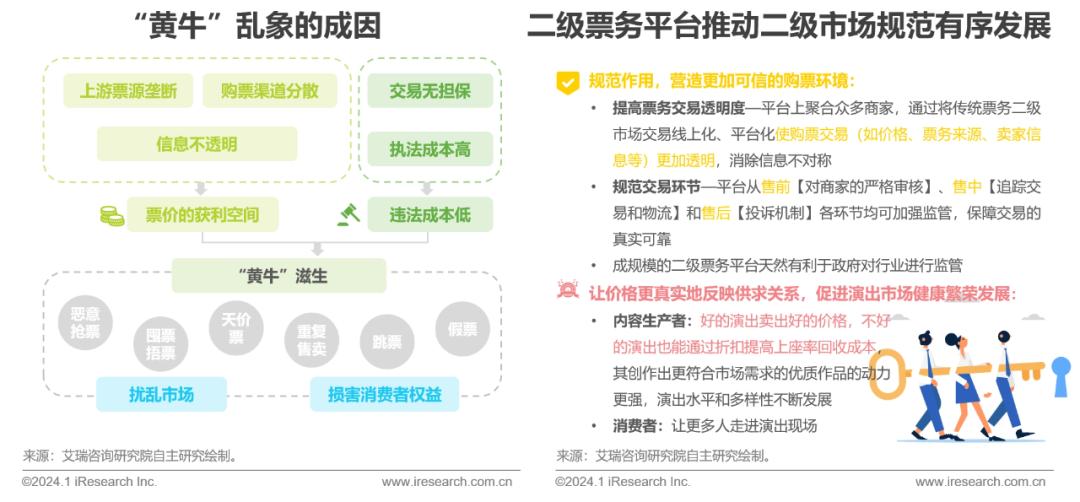 上游票源垄断,加上购票渠道的分散、信息不透明,使得票价上产生获利空间,而交易无担保、执法成本高更加成为了黄牛这个庞大群体滋生的土壤。要解决这些问题恰恰是互联网最擅长的。平台类交易聚合众多商家,并通过设置卖家准入门槛、平台担保机制、追溯交易路径等方法来提高票务交易透明度和规范度,为买卖双方营造更加真实可信的交易环境;同时,传统票务二级市场交易平台化使价格更加公开透明,缓解了黄牛哄抬票价造成的价格严重背离市场供求的问题,让价格更真实地反映供求关系,好的演出卖出好的价格,不好的演出也能通过折扣回收成本,激发内容创作者生产出更符合市场需求的优质作品,也让更多消费者以更合理的价格走进演出现场,享有更加丰富更高质量的精神文化生活,实现演出市场繁荣发展的多赢局面。