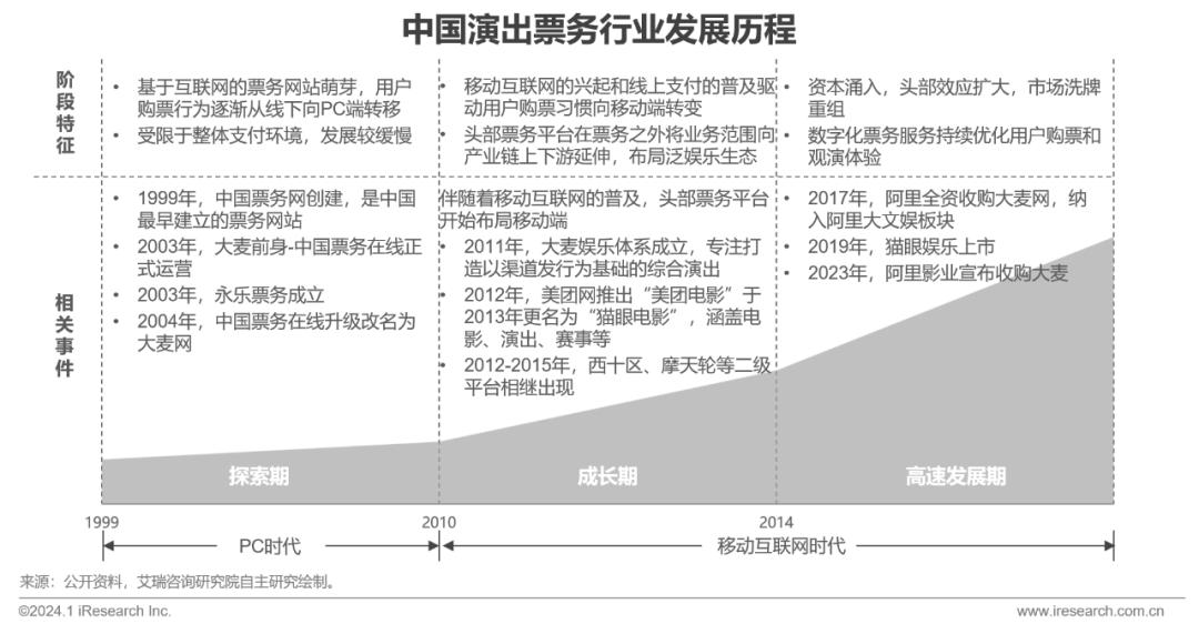 进入21世纪,互联网应用步入多元化发展阶段,各个垂直领域逐步出现了各个垂直内容的集合平台和工具应用,在PC互联网阶段,消费者购票行为逐渐从线下向PC端转移,集网上查询、网上订票为一体的专业化票务电子商务网站开始萌芽;2010年起,移动互联网快速发展,用户购票习惯从PC端转移到移动端,大麦网等头部票务平台布局移动端,并向产业链上下游拓展;2014年后,在资本推动之下,互联网巨头们不断抢滩在线票务市场,2017年阿里全资收购大麦,2019年猫眼娱乐上市,资本加持下的在线票务行业头部效应愈发明显。