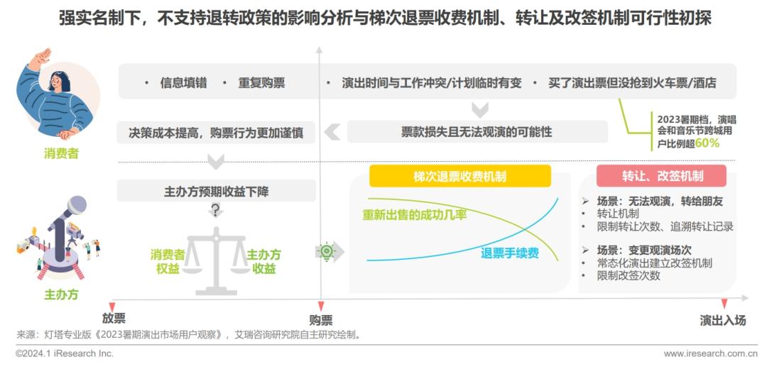 2023年9月由文旅部、公安部联合发布的《关于进一步加强大型营业性演出活动规范管理促进演出市场健康有序发展的通知》明确“大型演出活动实行实名购票和实名入场制度”,“强实名制”的人、证、票合一,一定程度上遏制了黄牛加价倒卖的违法行为,但不支持退票或转赠也增加了消费者的购买成本和决策成本,现场演出的放票时间一般前置数周,强实名制+不支持退转的要求增加了消费者的决策成本,可能会因为演出时间与工作或临时安排冲突等可能性而选择观望或放弃观演。因此,主办方应当完善票品退转改机制,设定合理的梯次退票收费标准,并在不同的时间节点对退票权利进行限制,权衡消费者权益与主办方经济效益;建立转让改签机制,限制用户转让或改签次数并实现转让记录可追溯。