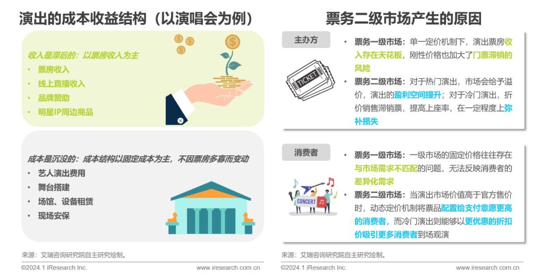 演出票务的分配机制(包括公开销售门票与内部票)为票务二级市场的出现提供了可能,而起到决定性作用的是一级市场下,供给端(演出主办方)与需求端(消费者)存在错位与失衡。于演出主办方而言,其核心是追求最大的票房收入与上座率,而演出收入的滞后性与高昂的成本使其面临较大的经营风险,一级市场的单一定价机制更是压缩了票房空间且放大了风险;于消费者而言,演出因承载着文化性与情绪价值,消费者对于其价值的认知存在差异,动态定价机制将票品得以配置给支付意愿更高的消费者,而冷门演出则能够以更优惠的折扣价吸引更多消费者到场观演。
