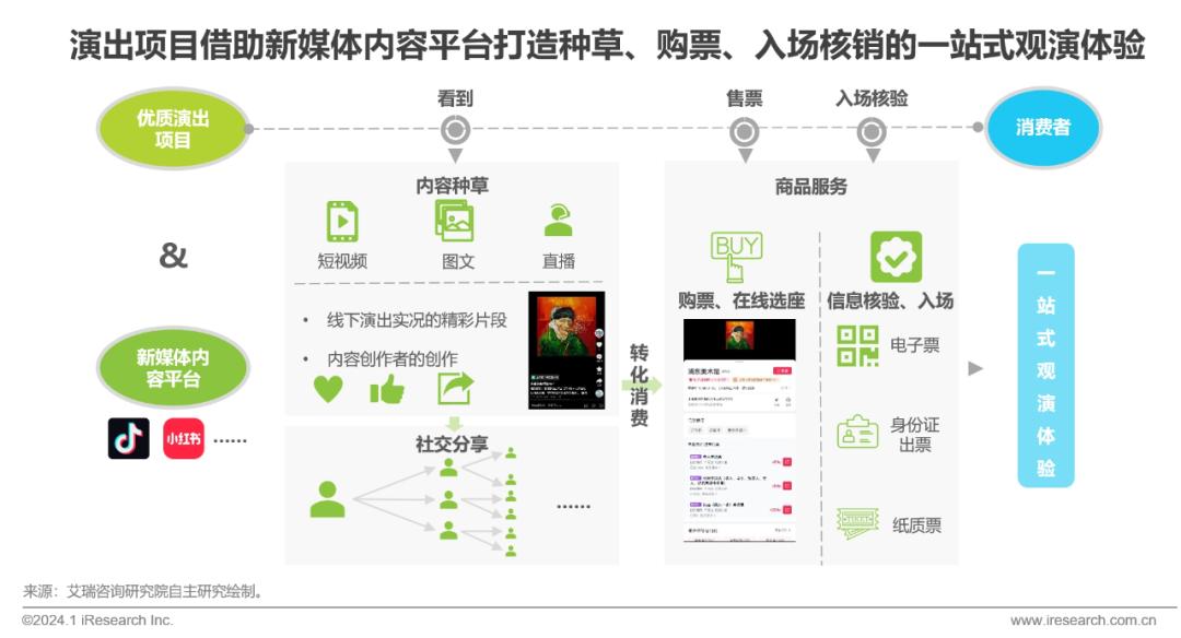 演出业态可与抖音、小红书等新媒体内容平台特性相结合,借助其从内容种草到转化消费再到社交分享的产品优势,通过短视频等内容形态最大程度展现演出项目亮点,实现演出项目在内容平台端更高效地传播,使得更多优质演出内容走到消费者面前,并为被种草的消费者提供购票、入场核销的一站式观演体验。