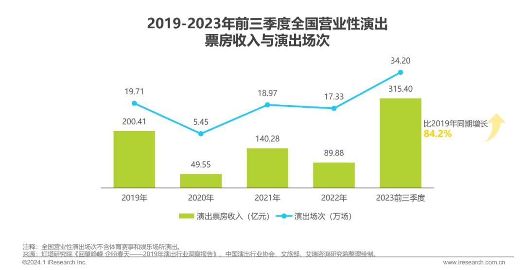 2022年底以来,我国经济社会全面恢复常态化运行,剧院、音乐厅等线下娱乐场所有序恢复,线下文娱消费需求得到集中释放。2023年前三季度,全国演出市场延续上行趋势,供给需求旺盛,市场活跃,演出市场迎来强劲复苏,实现票房收入315.40亿元,相较于疫情前的2019年同期,增幅达84.2%,且已超过2019年全年票房收入200.41亿元。