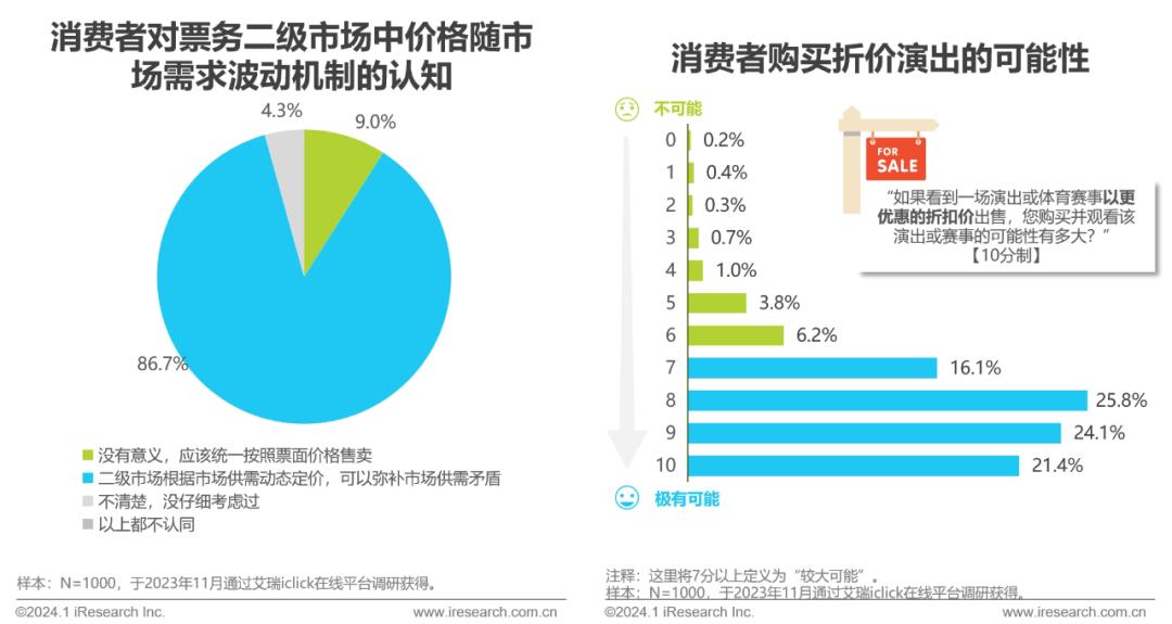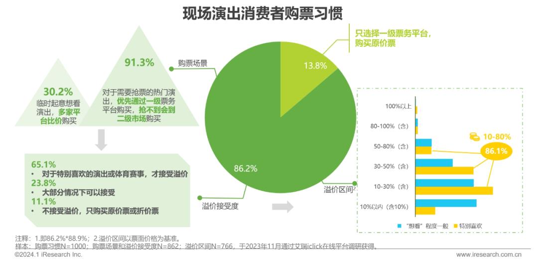 整体来看,接受溢价票的消费者占比达76.6%。对于特别喜欢的演出或体育赛事,86.1%的消费者可接受的溢价范围介于10-80%。可见在满足消费者观看热门演出及临时性观演需求方面,票务二级市场可以发挥调剂补充作用。