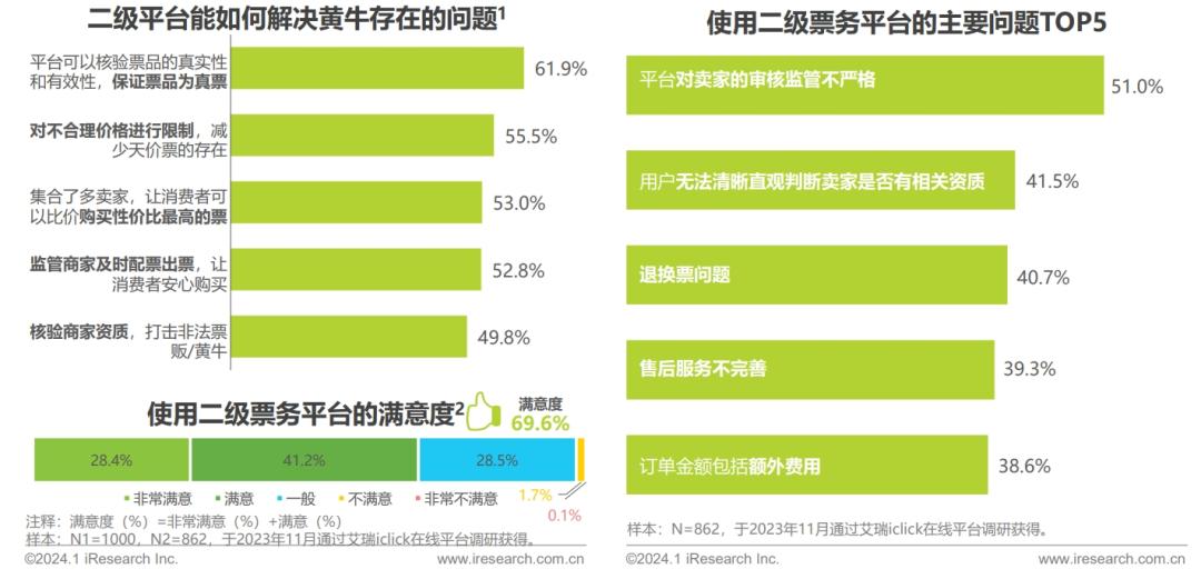 消费者认为二级票务平台可以通过采取票品保真等多种措施解决黄牛存在的问题,对二级平台的定位和期待是更多介入到票品质量的把控,以及交易行为、履约环节的监管和规范等方面。其整体满意度表现逊于一级票务平台,满意度水平达69.6%。消费者反馈使用二级票务平台遇到的最大问题是平台对卖家的审核监管不严格,同时退换票问题、售后服务不完善、订单金额不透明等问题也较为突出。平台的当务之急是结合消费者与商家交易过程的关键节点建立起全链路规范追踪体系,涵盖了购买前的商家准入与票品真实性核验、购买过程中的交易行为规范(如定价、配票发货时限等)、购买后的售后服务等。