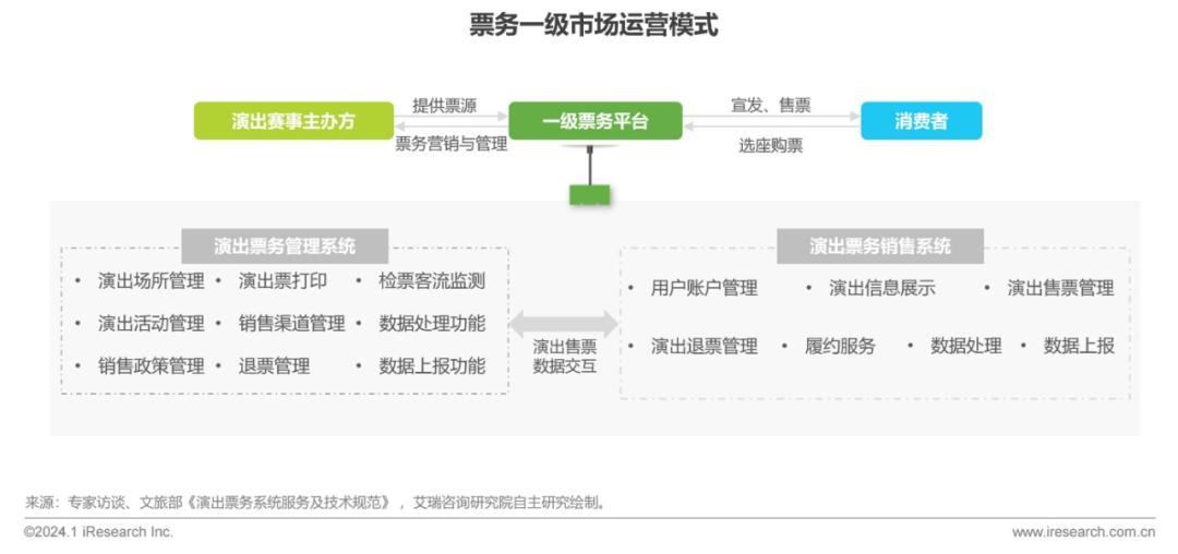 票务一级市场的票务来源于演出赛事主办方,以平台交易为主,门票根据演出赛事主办方制定的价格在一级票务平台上出售,采取不溢价不打折的单一定价模式,在提供票务销售服务之外,平台会提供演出赛事营销和活动管理服务,包括出票、检票等,价格及票品退换政策通常由主办方主导,平台向主办方收取代理费。对于大型现场演出活动或体育赛事,主办方往往会指定某一家平台作为票务总代理(票务总代),票务总代可联合其他一级票务平台共同为主办方提供销售服务,所有票包括纸质票和电子票均从票务总代出票,因此票务总代理需要同时具备票务销售系统和票务管理系统。