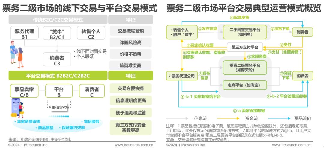 交易模式:票务一级市场以平台交易为主,票务二级市场交易模式包括传统线下交易模式以及平台交易模式。二级票务平台的本质是票务二级市场的数字化改造。平台汇聚了众多卖家和买家,提高信息透明度,并通过卖家严选机制、票品鉴定服务、交易保障体系等降低交易风险,为消费者带来更便捷、安心的购票体验。