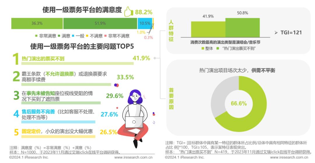 调研显示,消费者对一级票务平台的整体满意度水平达88.2%,所遇到的主要问题包括热门演出一票难求(41.9%)、不合理的退换票政策(33.5%) 、座位信息告知不充分导致观看视线受阻(29.6%)等。在“热门演出票买不到”的消费者中,消费次数最高的演出类型是演唱会/音乐节的占比达50.8%,相较于整体的41.9%,TGI指数达121,由于近半年演唱会/音乐节市场需求呈井喷式增长, “热门演出票买不到”的问题在该类演出爱好者表现得更加突出。而消费者认为“买不到”的首要原因是热门演出项目场次太少,供求严重失衡。
