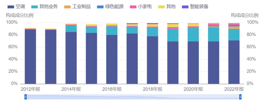 ▲图:格力2012~2022年营收占比图,图源同花顺iFind