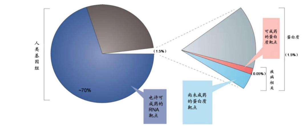 这一框架虽然能够治疗种类繁多的疾病,但却远未满足人类医学的需求。无论是化学小分子药物,还是生物抗体药物,它们的多是以蛋白质作为靶点,如激酶、受体、抗原等。但令人遗憾的是,超过80%的致病蛋白始终难以找到靶点,它们也被称为不可成药靶点。