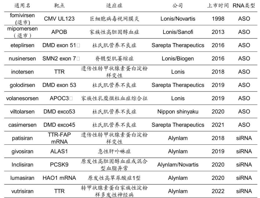 有了化学修饰和递送系统两大武器后,小核酸药物发展迅速,至今已经有13款药物上市。现阶段,小核酸药物主要包括两大类药物:ASO药物(反义寡核苷酸),siRNA药物(small interfering RNA)。