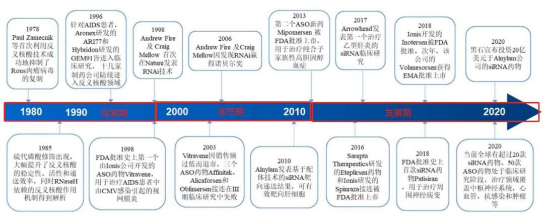 纵观小核酸药物发展历程,大致可以分为三个主要阶段:探索期(1978年-1998年)、迷茫期(1998年-2013年)、成长期(2013年至今)。