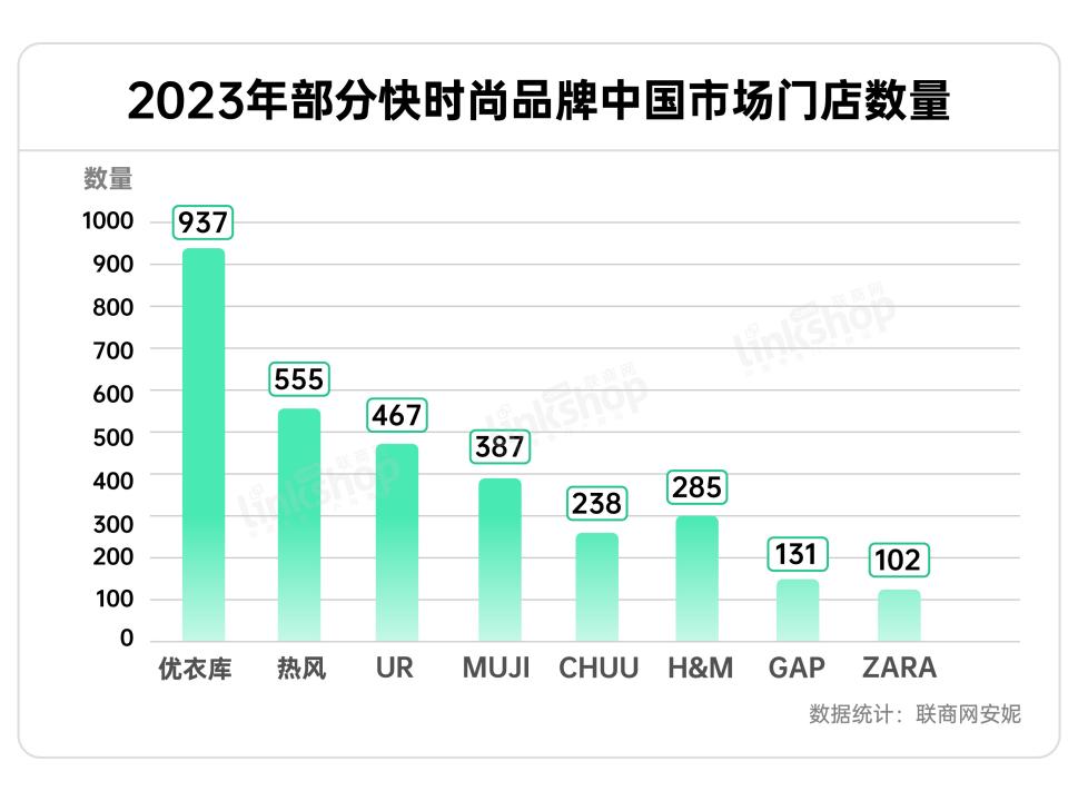 根据优衣库官网微信显示,截止2023年12月26日,优衣库中国市场门店总数为937家,占据《联商网》选取的样本(优衣库、MUJI、热风、UR、H&M、ZARA、GAP以及CHUU8家品牌)之首。紧随其后的则是热风,门店数量为555家;UR门店总数也达到了467家,位于榜单第三名,中国本土快时尚品牌也快速抢占市场;此后则是MUJI(87家)、H&M(285家)、CHUU(238家)、GAP(131家)以及ZARA(102家)。