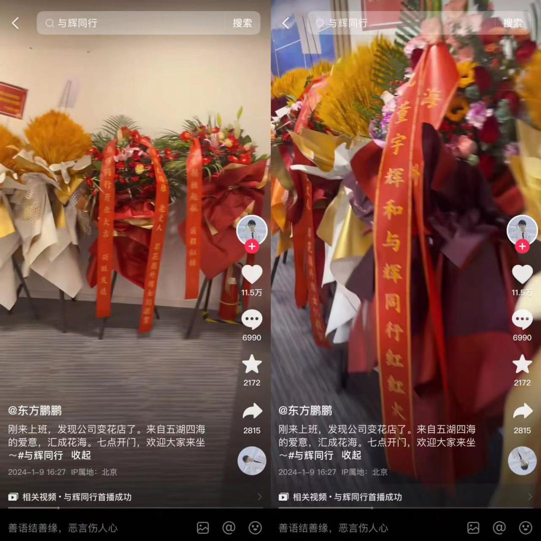 晚上出现在直播间的主播鹏鹏也在当天下午发抖音说,“刚来上班,发现公司变花店了。来自五湖四海的爱意,汇成花海。”董宇辉也在晚上的直播间笑着说,“今天这层楼的过道都塞满了,我都不知道谁送的花”,俞敏洪也调侃称,“我进来的时候在麦穗和花丛中间走了两分钟才走到。”