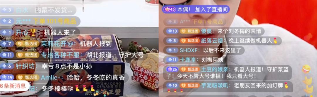 但与“与辉同行”直播间满屏的“开业大吉”弹幕不同的是,东方甄选直播间则飘起满屏的“机器人”弹幕。“与辉同行”开播前,东方甄选弹幕里有些粉丝留言告别“以后不会再来这个号了”“我们过去了”,选择留下支持的部分粉丝则以“湖北机器人报道”“新疆机器人报道”“辽宁机器人报道”等形式刷屏,有些粉丝还以自嘲口吻评论道“有血有肉的机器人来了”“会下单的机器人来了”。
