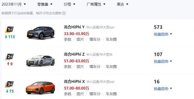 高合的传闻之所以引发业内关注原因或是其销量的下跌,2021年高合汽车卖出了4237辆,2022年卖出了4349辆,每月的交付量仅仅400辆左右。2023年,高合的月均销量只有355辆。高合汽车最近一次公布月交付量是去年11月,HiPhi Y车型10月交付1606台。此后,官方未公布 11 月、12 月的交付成绩。但懂车帝数据显示,高合汽车11月的交付情况中,三款车加起来销量共计696辆,而这三款车在10月的交付量为1834辆,或呈断崖式下跌。