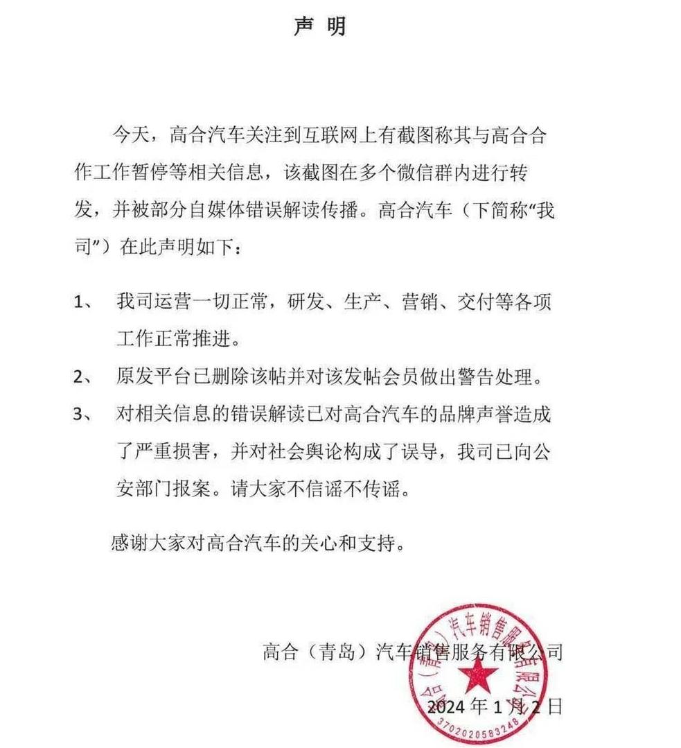 高合汽车有和劳斯莱斯同款的对开门、可自定义的 LED 灯带、可根据音乐旋转的大屏幕等众多宣传亮点,进入2024年,高合汽车经营情况恶化的情况被经济观察网报道,和讯、凤凰网报道显示,高合汽车或存在裁员、撤店、供应商断供情况,1月2日高合汽车强势辟谣,甚至要起诉“造谣者”。