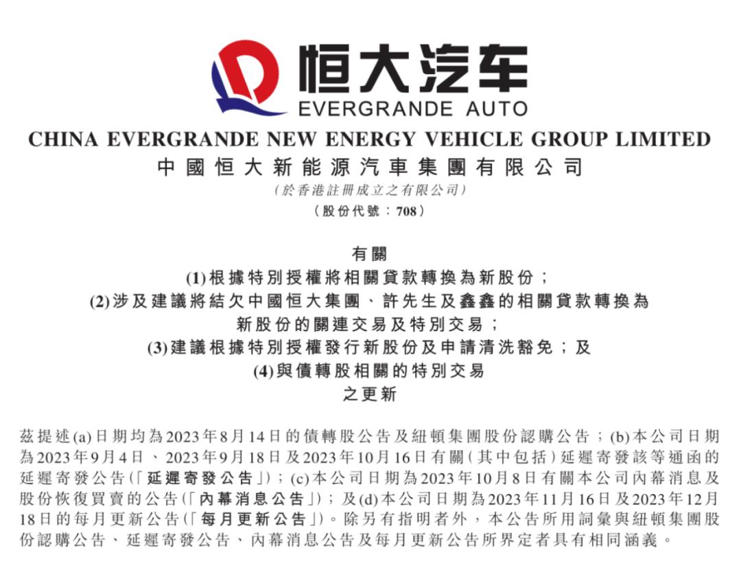 2023年8月,在恒大汽车停牌16个月后,离香港证券交易所规定的18个月连续停牌将强制摘牌的期限只剩下2个月,恒大汽车和阿联酋新能源汽车品牌纽顿集团签署投资协议。协议大致内容是纽顿集团将认购恒大汽车61.8亿股新股,占扩大发行后总股本的27.5%左右,当时每股认购价为0.6297港元,总量约为5亿美元,合人民币39亿元。