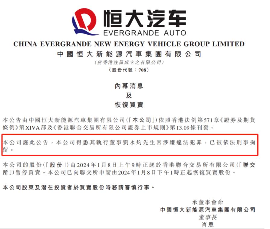 1月8日,恒大汽车发布公告称其执行董事刘永灼因涉嫌违法犯罪已被依法刑事拘留,为此恒大汽车申请了短暂交易停牌,并于当日恢复交易。
