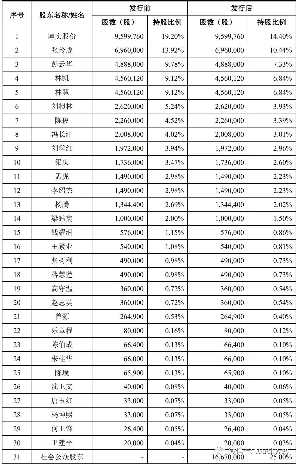 IPO后,博实股份持股为14.4%,张玲珑持股为10.44%,彭云华持股为7.33%,林凯、林慧分别持股为6.84%,刘昶林持股为3.93%,陈俊持股为3.39%,冯长江持股为3.01%,刘学红持股为2.96%,梁庆持股为2.6%;