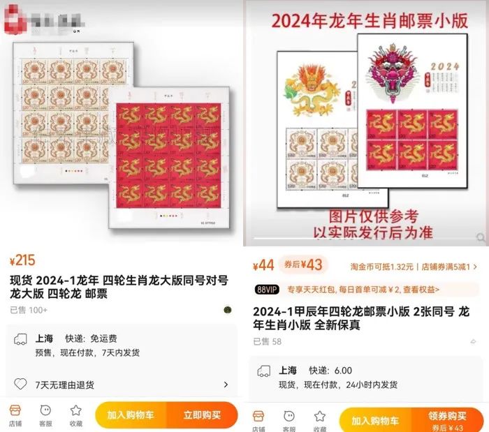 中国邮政于5日正式发行的《甲辰年》特种邮票,一套两枚,名称分别为“天龙行健”和“辰龙献瑞”,面值共计2.4元。中新经纬注意到,龙年邮票在二级市场的身价陡增,一套32枚的大版邮票,面值38.4元,在某电商平台上,有商家报价215元,溢价幅度高达459.9%。