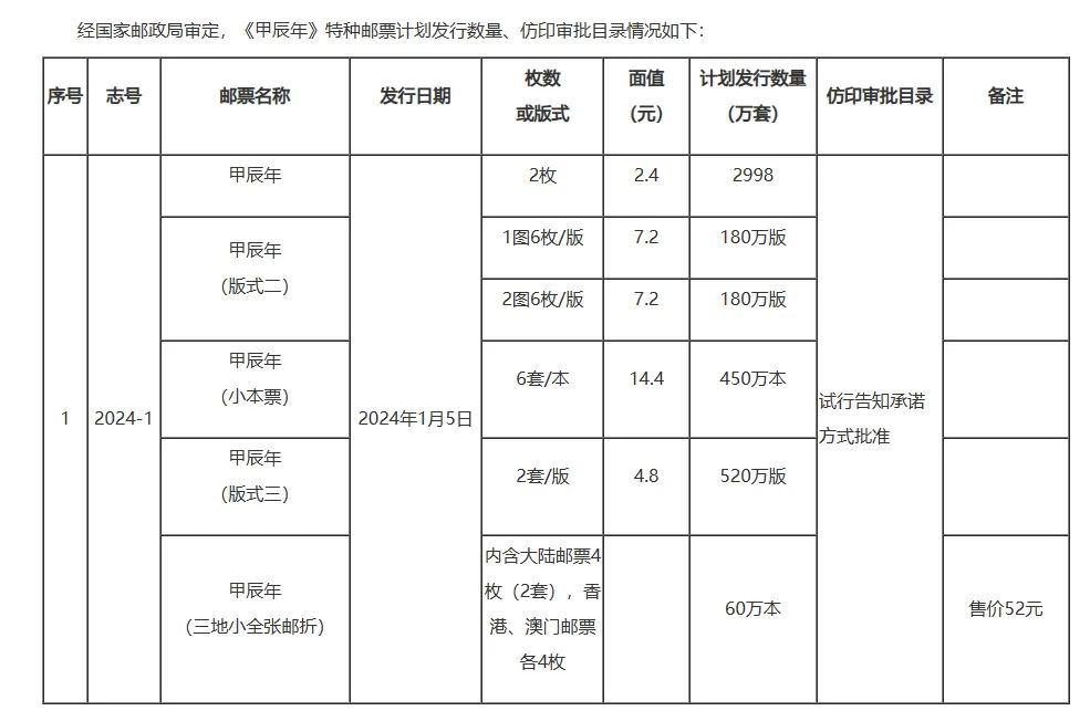 从国家邮政局公布的发行数量来看,本轮甲辰年的生肖邮票,“天龙行健”和“辰龙献瑞”的发行量共计2998万枚;小版票180万版共计2160万枚;小本票450万本共计5400万枚;版式三520万版共计2080万枚;大陆、香港、澳门三地小全张邮折60万本共计720万枚。也就是说,龙年发行的生肖龙票,合计数量为1.336亿枚,与兔年1.839亿枚相比,同比下降27.35%。