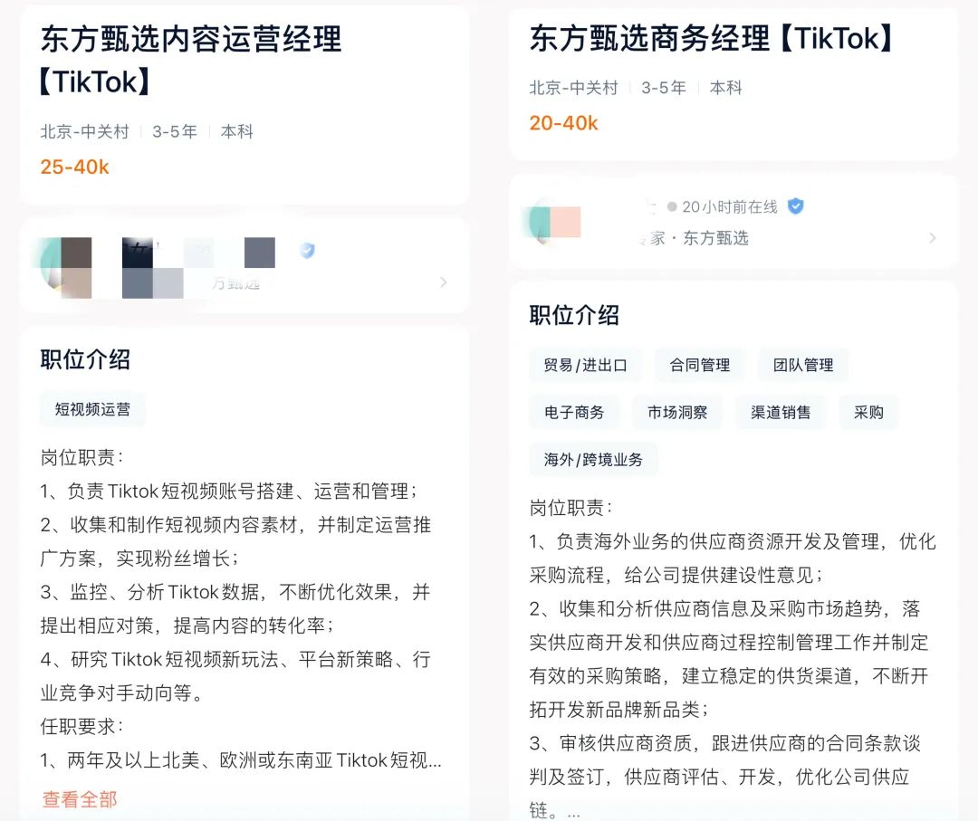 几天前,东方甄选在招聘软件猎聘上发布了多个TikTok方向的职位,例如运营经理、内容运营经理、商务经理、TikTok海外店铺运营等,给出的月薪范围在2万-4万元之间。