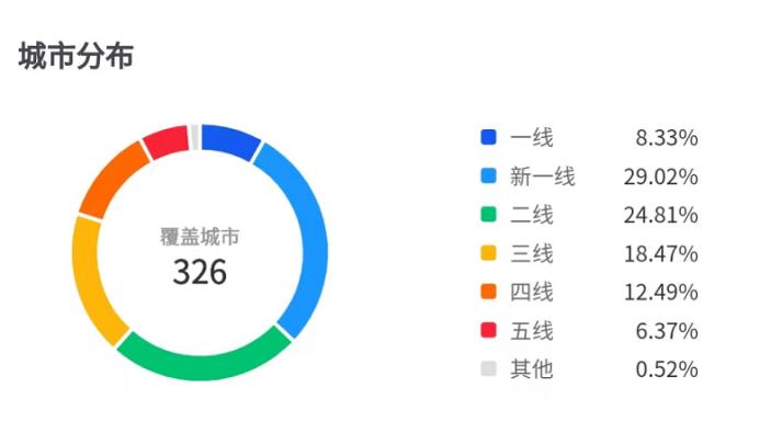 而在窄门餐眼显示的库迪城市分布图中,一线城市仅占比8.33%,二线及以下城市占比为62.65%。蜜雪冰城旗下的咖啡品牌幸运咖更是走着蜜雪冰城的老路,主攻下沉市场,2700+门店中,二线及以下城市分布占比达到80.92%。超级品牌瑞幸二线及以下城市的门店也占比48.93%。