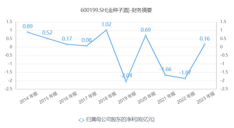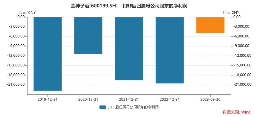 Wind数据显示,2019年至2022年,金种子酒的扣非归母净利润分别约为-2.28亿元、-1.14亿元、-1.96亿元和-2.06亿元。2023年前三季度,金种子酒的扣非归母净利润为-0.49亿元。