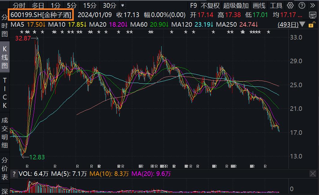 2024年1月9日,金种子酒以平盘报收17.13元,盘中股价最低跌至17.01元,这是其自2022年2月17日以来的最低股价。