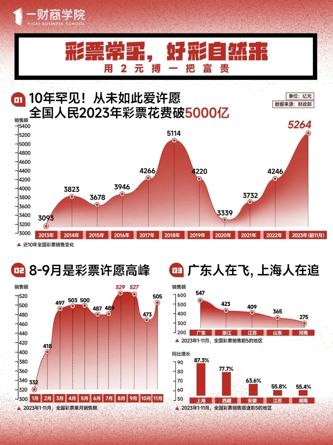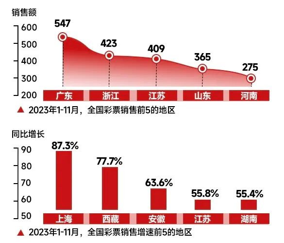 2023年,股票仍在保卫3000点,彩票一骑绝尘:自2007年2月16日首次站上3000点以来,A股在近17年时间里经历了近50次“3000点保卫战”。2024年1月9日,A股收盘价仍在2900点徘徊。另一头,截至2023年11月,全国彩票销售收入创纪录,超过2018年5114.72亿元的销售高峰,预计2023全年彩票销售将达5800亿元。