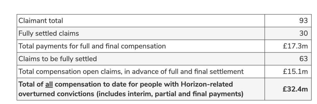 事实上,在 93 项被推翻的定罪中,只有 30 人同意「全面、最终和解」。据邮局公司透露,迄今为止,已支付超过 3240 万英镑的赔偿。