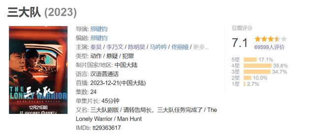 2023年尾牙之际,爱奇艺迷雾剧场出品的压轴新剧《三大队》,凭借着秦昊+ 李乃文 + 陈明昊的实力演技派组合,市场受众面很广的烧脑悬疑片,鲜活生动的人物群像、生活线与悬疑线,又让大伙上头了:截至1月9日,在豆瓣上已有超7万人参与评价该剧,25630人看过,2183人在看,337人想看,并综合给出“值得一看”的7.1分。