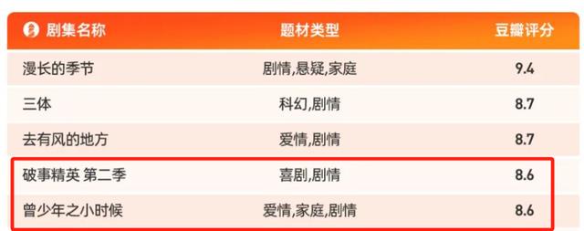 这其中,来自爱奇艺平台的有6部,占比26.1%,仅次于腾讯视频;按照评分由高到低,前三名分别是腾讯视频的《漫长的季节》《三体》和芒果tv的《去有风的地方》,爱奇艺的《破事精英 第二季》《曾少年之小时候》均为8.6分,位列四、五位。