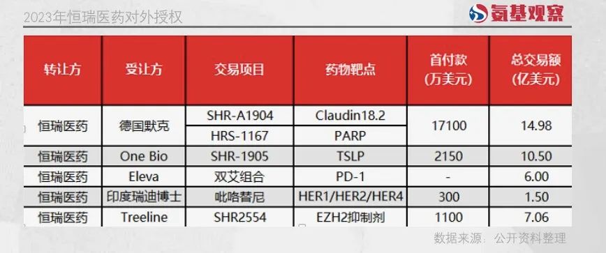 2023年年初,恒瑞医药将江宁军招至麾下,进行BD部门的升级。去年以来,恒瑞医药先后五次达成license out,总交易金额从1.5亿美元至15亿美元不等。
