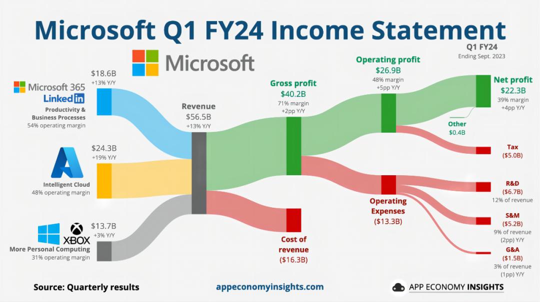 微软 2024 财年 Q1(2023 年 7-9 月)财报数据 | 来源:App Economy Insights