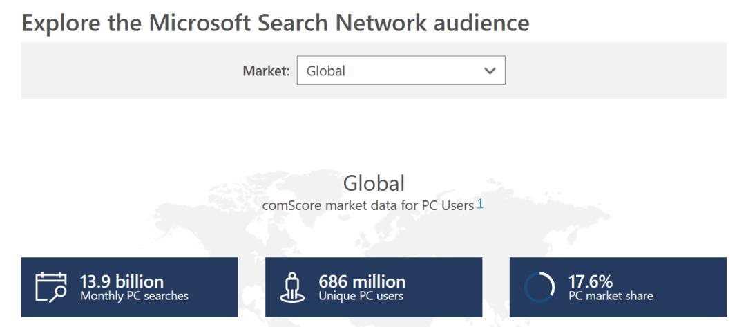 微软搜索广告涵盖了来自 Bing Web 搜索、AOL.com Web 搜索、和 Yahoo! Web 搜索的非重复访客,包括 PC 端、移动网络和平板电脑流量。根据微软官方数据,全球每月使用微软搜索网络的用户超过 6.8 亿(美国市场约 1.09 亿),值得注意的是,这其中不用 Google 搜索的用户有 2 亿多。